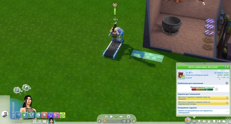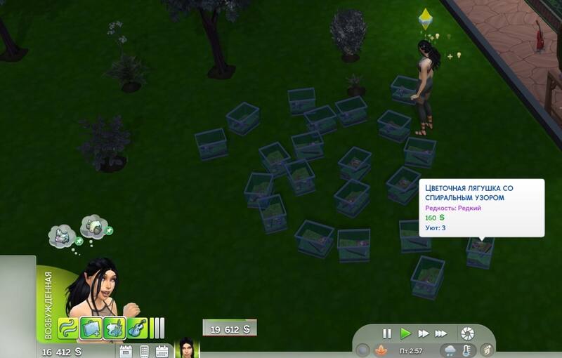 Но у Лори все еще выходные. Поэтому беговая дорожка, пианино, котел - и нова порция лягушек на продажу (как хорошо что в Симс такие фокусы не снижают редкость товара).