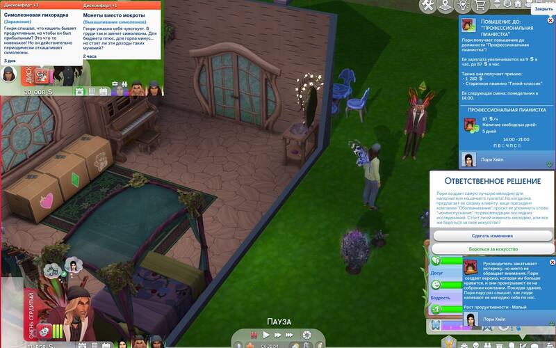 В пятницу Лори пришла без повышения - и отправилась к котлу и на прочие медитации. Парни продолжали закатывать вечеринки - и общать оставшихся в родном городе родичей. Где Генри ухитрился подхватить болезнь - не помню. Болезнь оказалась полезной (откашдивал он по 80 симолеонов), но симика было жалко. Так что пока Лори получала повышение, а Генри мучился - Олевандр качал способности феи, чтобы помочь брату.